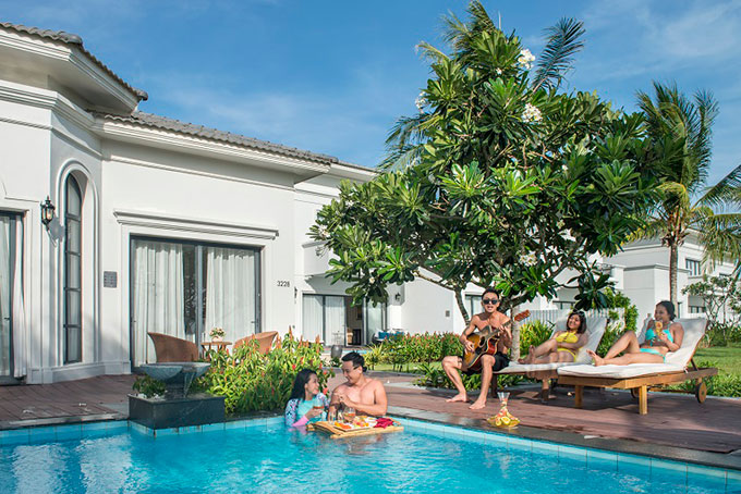 Khi ánh bình minh khẽ chạm đến khung cửa phòng ngủ, du khách sẽ thức giấc trong tiếng sóng vỗ rì rào và hương café đầu ngày tỏa khắp từ phòng khách. Những món ăn sáng tươi ngon được bày biện đẹp mắt, sang trọng trên bàn ăn. Phía ngoài hồ bơi, tiếng trẻ thơ đùa nước, vui cười giòn tan như mảnh ghép hoàn hảo cho bức tranh đoàn viên hạnh phúc ở một nơi “không có khói bụi thành phố” và những lo toan, tất bật hàng ngày.