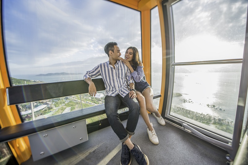 Từ độ cao 60m so với mực nước biển, mỗi chuyến cáp treo là hành trình chiêm ngưỡng vẻ đẹp của vịnh biển trong xanh và kỳ vĩ. Về chiều, từ ánh hoàng hôn huyền diệu trên vịnh biển đến ánh đèn lấp lánh từ những tháp trụ cáp treo soi bóng trên mặt nước cùng góp mặt trong một bức tranh lung linh rất đáng để thưởng lãm cùng gia đình, bạn bè.