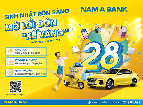 Từ 19/10/2020 đến 19/01/2021, Nam A Bank triển khai chương trình khuyến mãi chào mừng sinh nhật lần thứ 28 với “mưa” quà tặng như: xe Vinfast Lux A2, xe máy Vespa, iPhone 11 Pro Max, Samsung Galaxy S20, máy tính bảng, robot hút bụi…