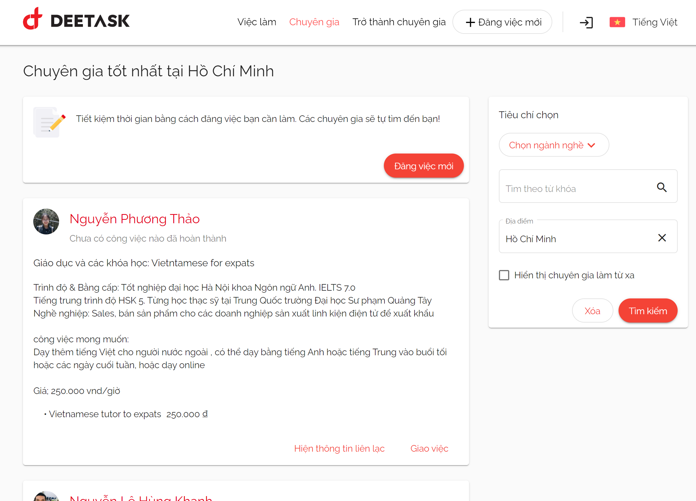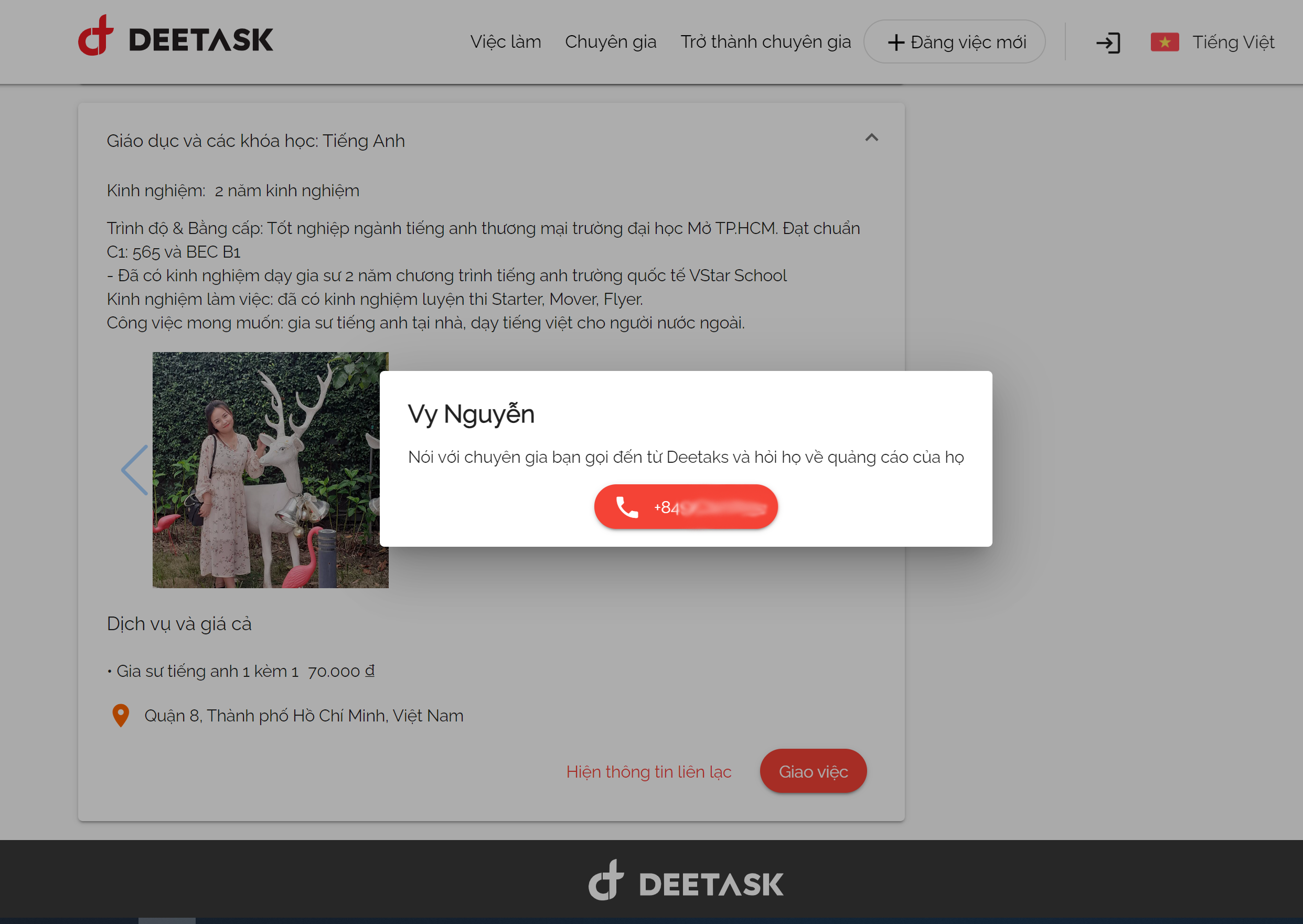 Deetask.com, điều khiến tôi bất ngờ chính là giao diện dễ dùng cho bất cứ ai, thậm chí các bậc ông bà đã lớn tuổi. Deetask giúp người dùng tìm kiếm giáo viên tốt nhất dựa trên nhu cầu, ngân sách của mình. Tôi hoàn toàn có thể tự mình xem thông tin cá nhân, đọc các đánh giá và tỷ lệ hoàn thành công việc trước đây của giáo viên và tự mình liên hệ với họ mà không phải qua bất cứ người môi giới nào.
