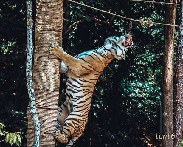 Ngay bên cạnh, những vị chúa sơn lâm đang chia nhau mỗi người một “lãnh địa” để săn thức ăn được giấu khắp khu rừng. Khi đánh hơi chính xác và định vị được mục tiêu, chỉ một cú song phi nhẹ nhàng đã nhấc bổng thân hình chúa sơn lâm đồ sộ lên không trung và chộp lấy chính xác miếng mồi tươi ngon được treo lơ lửng trên sợi dây thừng. Sư tử thích thú săn mồi là những bữa ăn ngon lành được giấu trong những bụi cây.