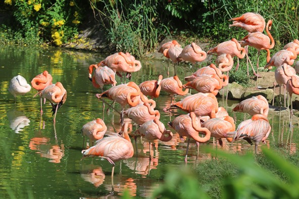 Đối nghịch với đàn tê giác “đồ sộ”, hổ Bengal, sư tử uy nghiêm là sự thanh thoát và rực rỡ của đàn hồng hạc vừa thức giấc, đang tỉa tót làm duyên bên hồ xanh um bóng cây. Hôm nay, bữa sáng của đàn hồng hạc là tôm và cua trộn hạt bắp ngon lành. Đàn chim yêu kiều nhất của vườn thú luôn thích thú khi được thưởng thức các món ăn như tảo xoắn, các loại hạt và đặc biệt không thể thiếu là động vật giáp xác. Chất tạo màu carotenoid bên trong loại thức ăn này sẽ được phân hóa thành những phân tử mang sắc tố hồng và cam, tạo nên bộ lông tuyệt đẹp rực rỡ của loài chim quý.