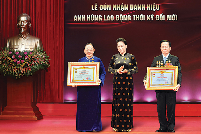 Chủ tịch Quốc hội nhiệm kì 2016-2021 Nguyễn Thị Kim Ngân trao danh hiệu Anh hùng Lao động thời kỳ đổi mới cho ông Lê Văn Kiểm và bà Trần Cẩm Nhung