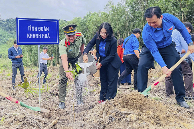 Các cán bộ, đoàn viên, thanh niên tham gia Tết trồng cây tại xã Khánh Hiệp (huyện Khánh Vĩnh). |