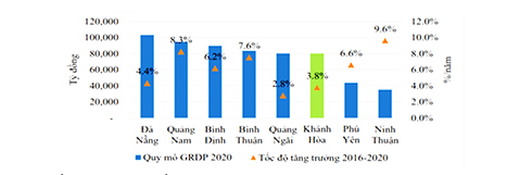 Hình 1 cho thấy rõ thứ hạng khiêm tốn của Khánh Hòa trong vùng còn “khiêm tốn” về thứ hạng phát triển đó: quy mô GRDP năm 2020 xếp thứ 6/8 (tỉnh), tốc độ tăng trưởng GRDP giai đoạn 2016-2020 đứng thứ 7/8.