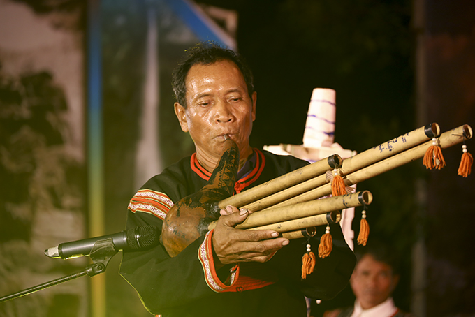 Nghệ nhân người Ê đê ở xã Khánh Hiệp (huyện Khánh Vĩnh) biểu diễn khèn bầu. |