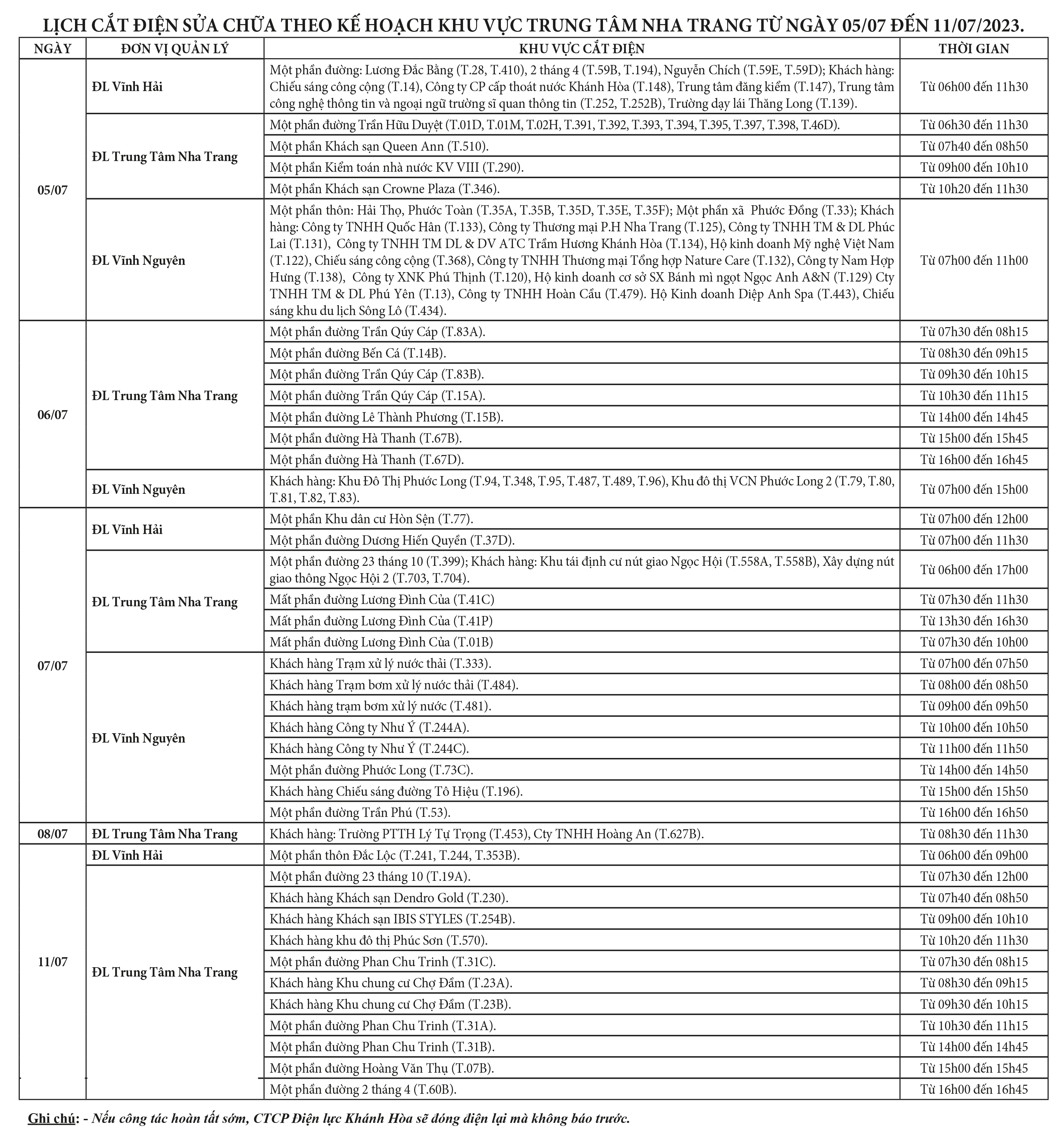 Lịch cắt điện Khu vực Nha Trang từ ngày 05-07 đến ngày 11-07-2023