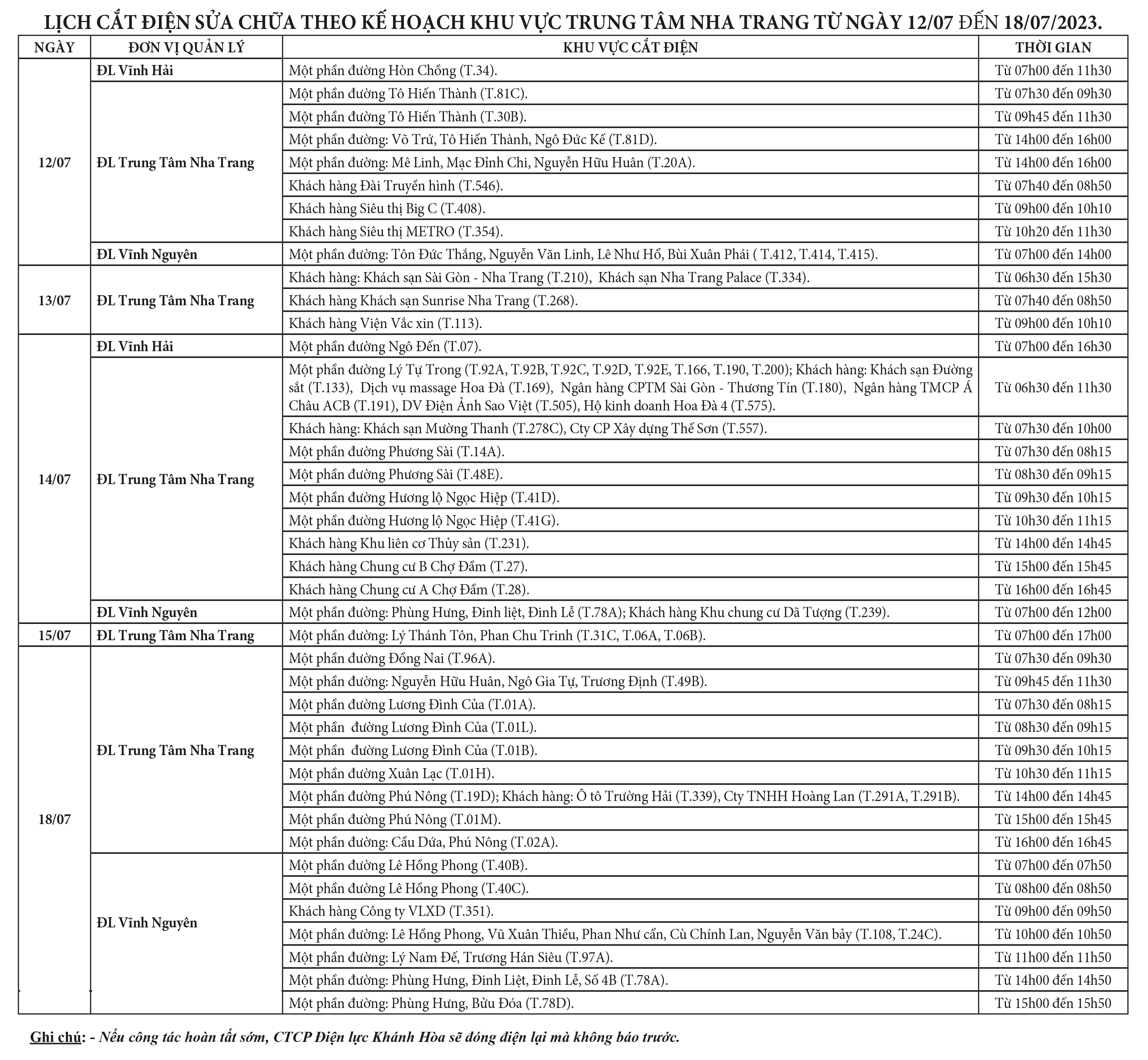 Lịch cắt điện Khu vực Nha Trang từ ngày 12-07 đến ngày 18-07-2023