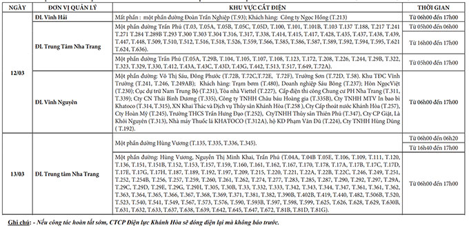 Lịch cắt điện Khu vực Nha Trang từ 12 và 13-3-2022