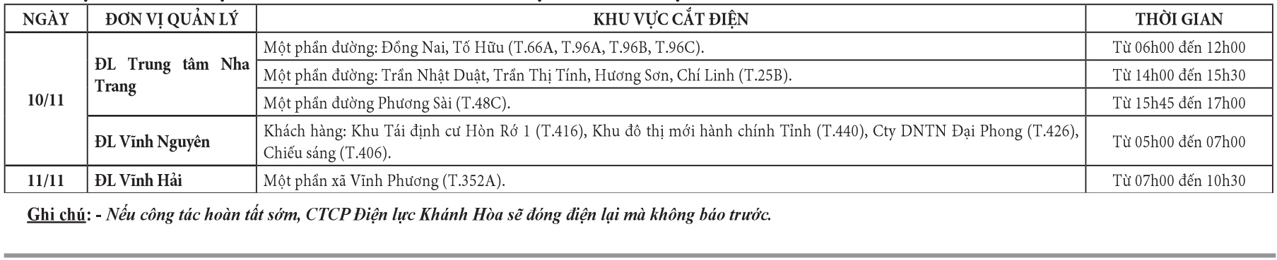 Lịch cắt điện Khu vực Nha Trang từ 10 đến 11-11-2021