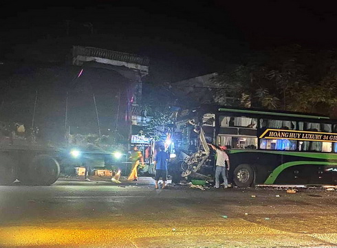 Lúc này, xe khách thuộc nhà xe Huy Hoàng, biển số 76B-01364 do ông Nguyễn Hữu Quân (sinh năm 1982, trú huyện Núi Thành, Quảng Nam) cầm lái, từ phía sau chạy tới đã tông thẳng vào đuôi xe tải 89C-05844. Cú tông trực diện đã khiến đầu xe khách biến dạng.