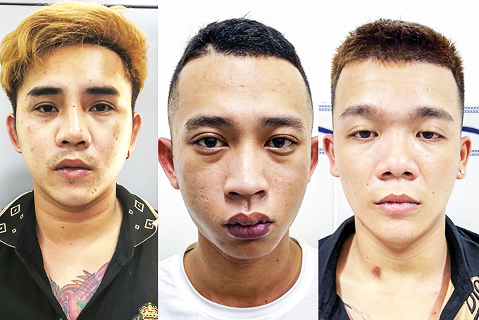 Các đối tượng cộm cán (từ trái qua): Nguyễn Tấn Di, Phan Quốc Toàn, Ngô Thành Đạt lúc bị bắt.... |