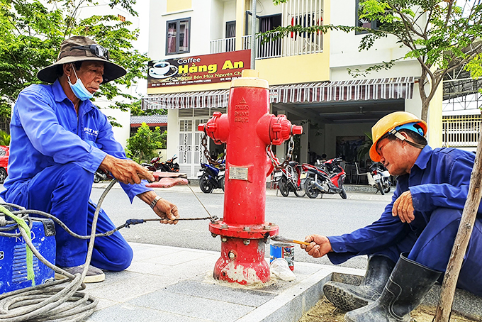Công nhân một khu đô thị ở phường Phước Long tiến hành hàn ốc vít vào phần đế trụ nước chữa cháy để chống trộm. |