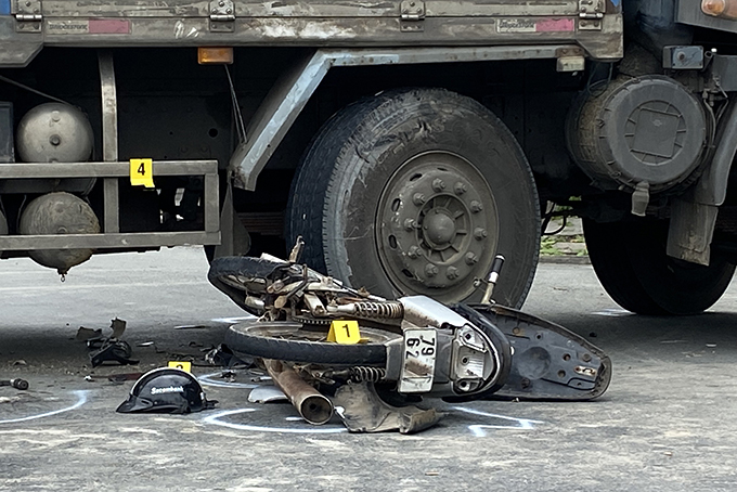 Theo một số người dân, khi xe tải mang biển kiểm soát (BKS) 79H-00163 rẽ sang đường thì xe máy mang BKS 79L6-6227 lưu thông theo hướng Nam-Bắc đâm vào xe tải. Tai nạn đã làm 2 người ngồi trên xe máy bị thương nặng, xe máy tan nát nằm dưới bánh xe tải.