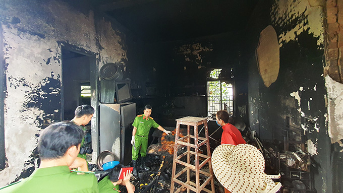 Tại bếp của căn nhà, các cán bộ điều tra tập trung vào việc thu thập nhiều thiết bị điện đã bị thiêu rụi để tiến hành các hoạt động điều tra, xác định nguyên nhân dẫn đến hỏa hoạn.
