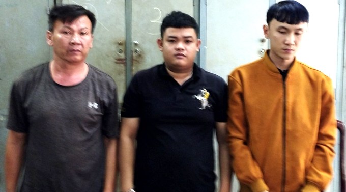 Các đối tượng (từ trái qua): Thuận, Vũ và Liêm tại cơ quan công an. |