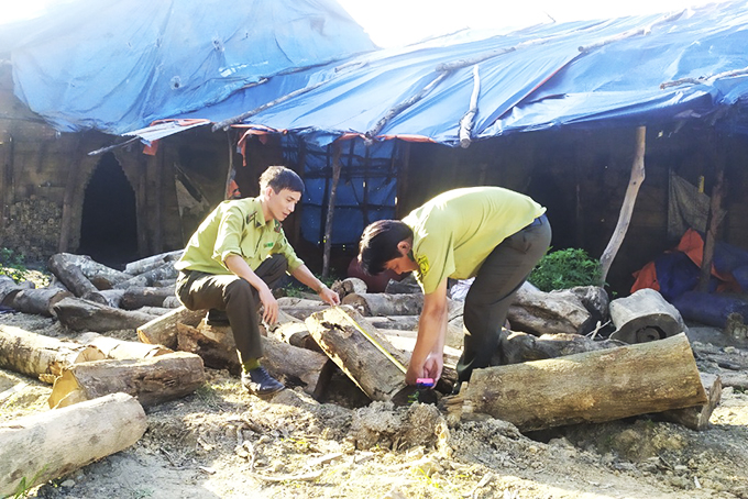 Lực lượng kiểm lâm kiểm tra, đo đạc gỗ tại lò than ở thôn Đắc Lộc, xã Vĩnh Phương. |