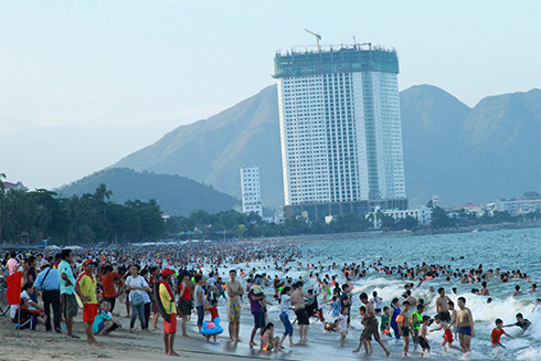 Trong 4 ngày nghỉ lễ 30-4 và 1-5, vào các buổi chiều, bãi biển Nha Trang luôn trong tình trạng đông kín người dân và du khách ra tắm biển hoặc ngắm biển.