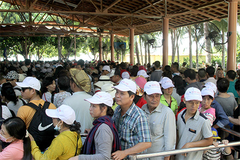 Du khách xếp hàng chờ đi cáp treo qua Vinpearl Land Nha Trang.