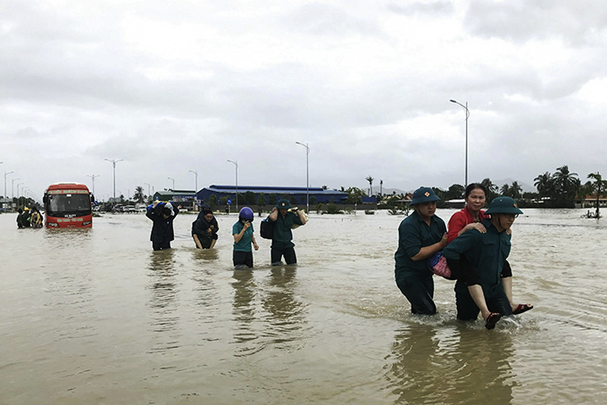 Lực lượng dân quân TP. Nha Trang giúp người dân di chuyển qua đoạn đường ngập lụt. |
