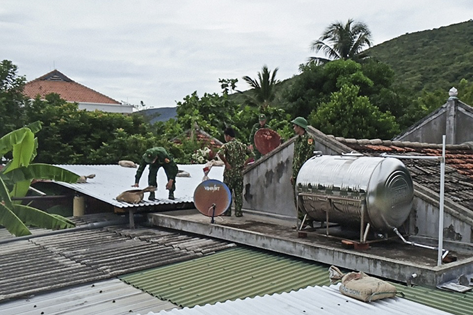 Bộ đội biên phòng giúp đỡ người dân đảo Bích Đầm chằng néo nhà cửa trước bão số 4.