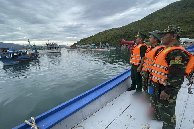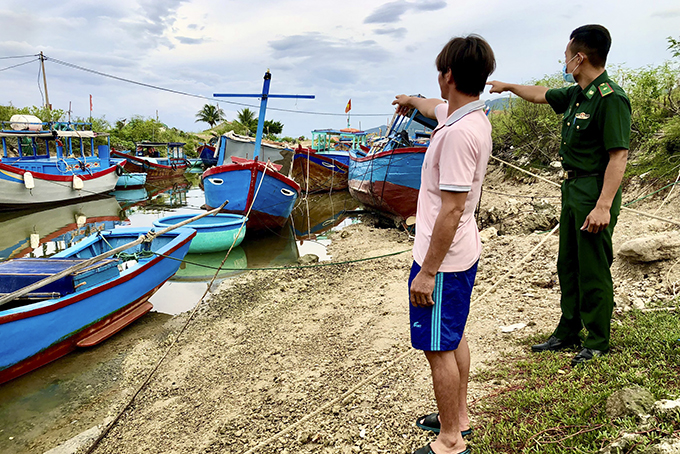 Lực lượng Đồn Biên phòng Ninh Hải kêu gọi, hỗ trợ tàu thuyền neo đậu an toàn tại Khu neo đậu tàu thuyền tránh trú bão Ninh Hải.