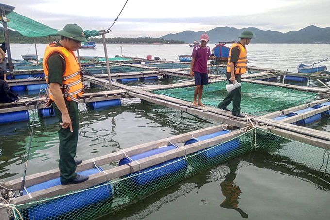 Đồn Biên phòng Vĩnh Lương tuyên truyền người dân di dời lồng bè đến nơi an toàn.