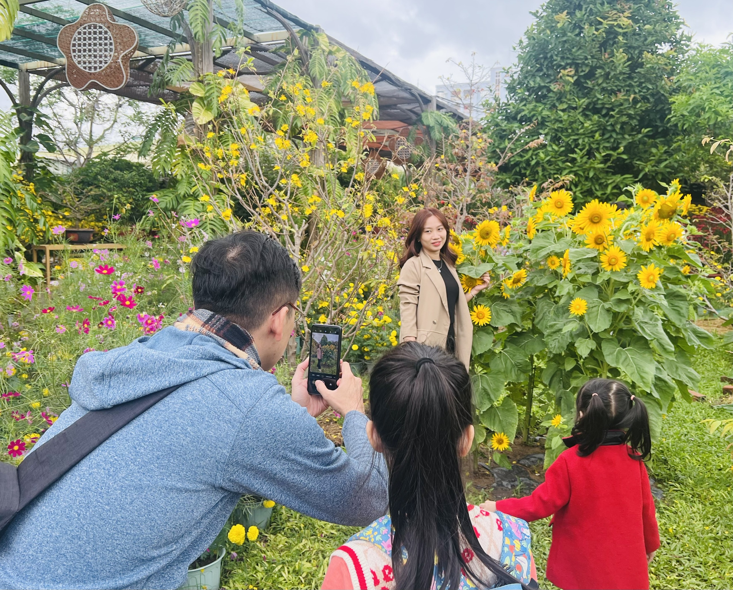 Khách đi dạo tham quan vườn hoa của Làng nghề Trường Sơn.