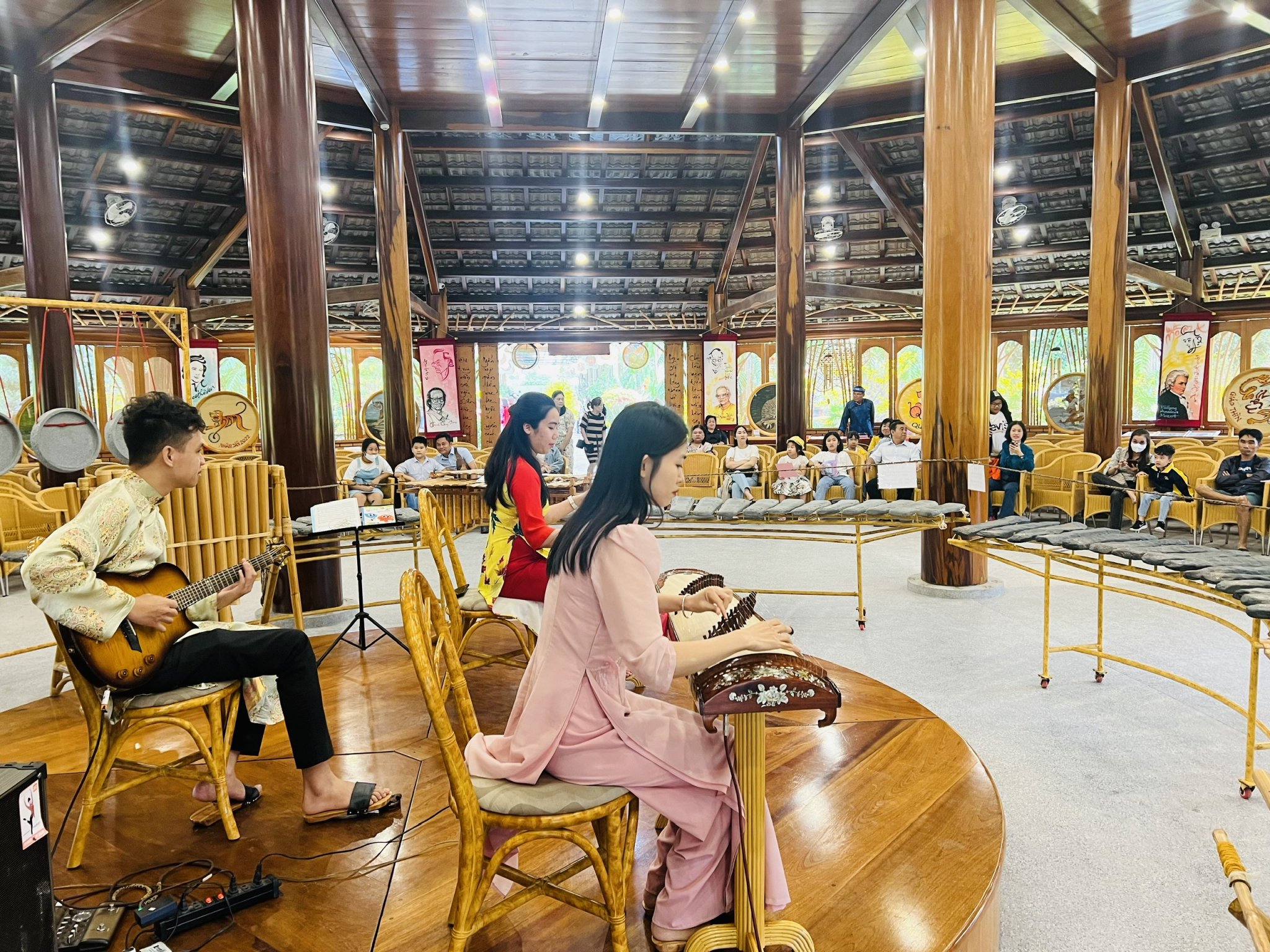 Rất đông du khách thưởng thức tiết mục hòa tấu nhạc cụ dân tộc ở làng nghề.