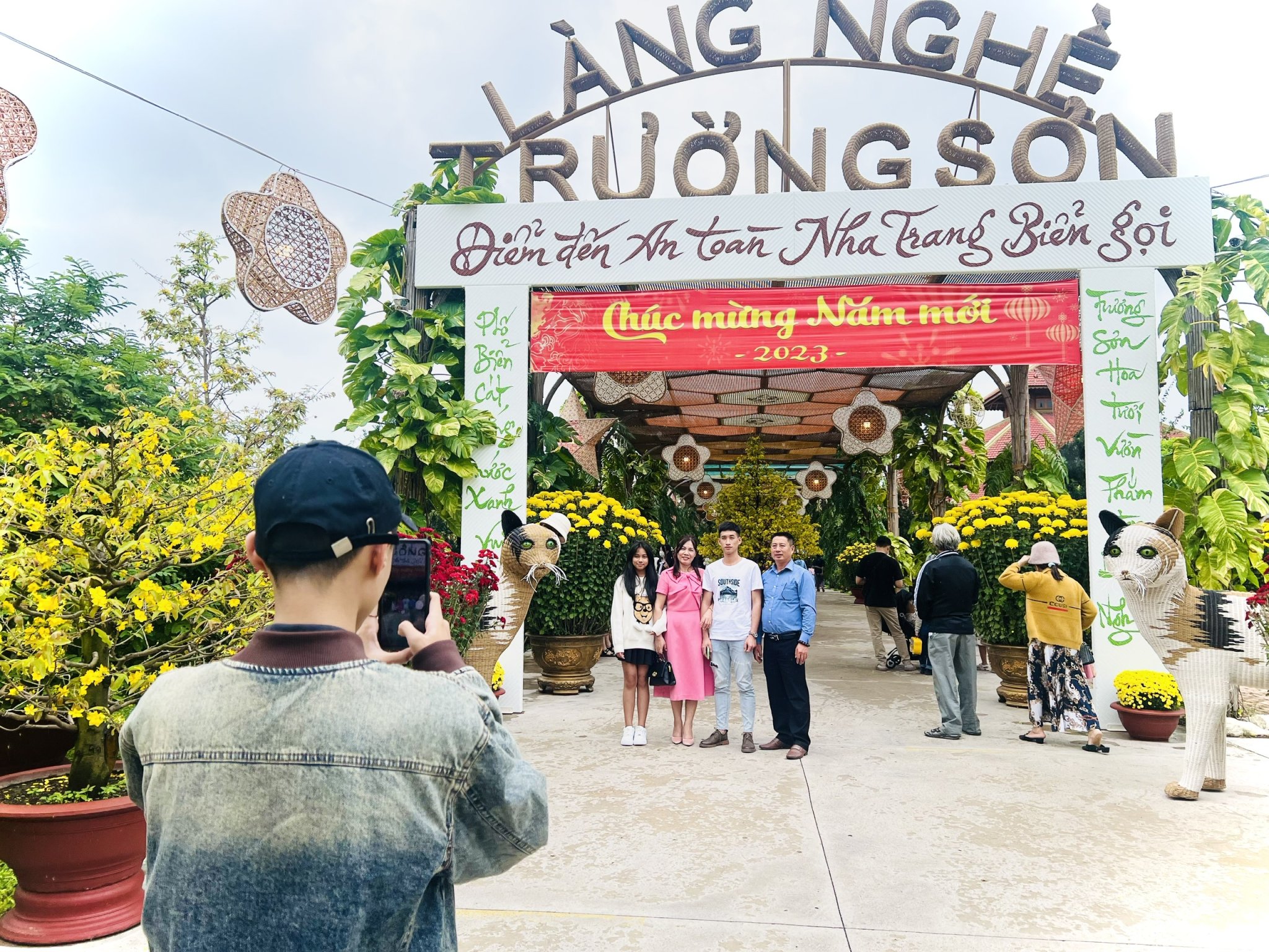 Tết Quý Mão 2023, Làng nghề Trường Sơn (số 8 đường Trường Sơn, TP. Nha Trang) rực rỡ sắc vàng với 1.000 chậu hoa mai nở rộ. Vườn hoa của làng nghề còn rực rỡ sắc vàng hoa hướng dương, hoa cúc, hoa hồng, hoa bươm bướm rất đẹp mắt… Khách du xuân ở làng nghề còn được nghe các tiết mục hòa tấu nhạc cụ dân tộc, ngắm nhìn tranh thư họa danh nhân của nhà thư pháp Lê Vũ, tượng gốm của nhà điêu khắc Đoàn Xuân Hùng. Đặc biệt, Tết năm nay, Làng nghề Trường Sơn trưng bày bộ tranh cát 12 con giáp tuyệt đẹp do gia đình nghệ nhân Trần Thị Thu thực hiện. Khách đến làng nghề còn được xem các sản phẩm thủ công mỹ nghệ như đan lưới, dệt chiếu, chằm nón, đồ gỗ mỹ nghệ… Rất đông khách du lịch và người dân Nha Trang - Khánh Hòa đến Làng nghề Trường Sơn du xuân, vui Tết. Trong 4 ngày đầu năm Quý Mão, làng nghề đã đón gần 7.000 lượt khách tham quan, trong đó cao điểm nhất là ngày mùng 2 Tết với gần 3.000 lượt khách tham quan. Để thuận tiện cho du khách, năm nay Làng nghề còn có thêm dịch vụ cho thuê áo dài để chụp ảnh.