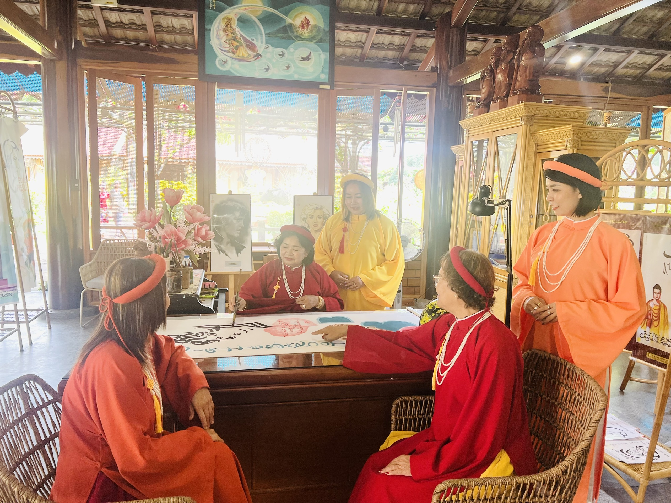 Có du khách còn thích thú khi ngồi vào bàn viết của nhà Thư pháp Lê Vũ tập làm ông đồ viết chữ thư pháp