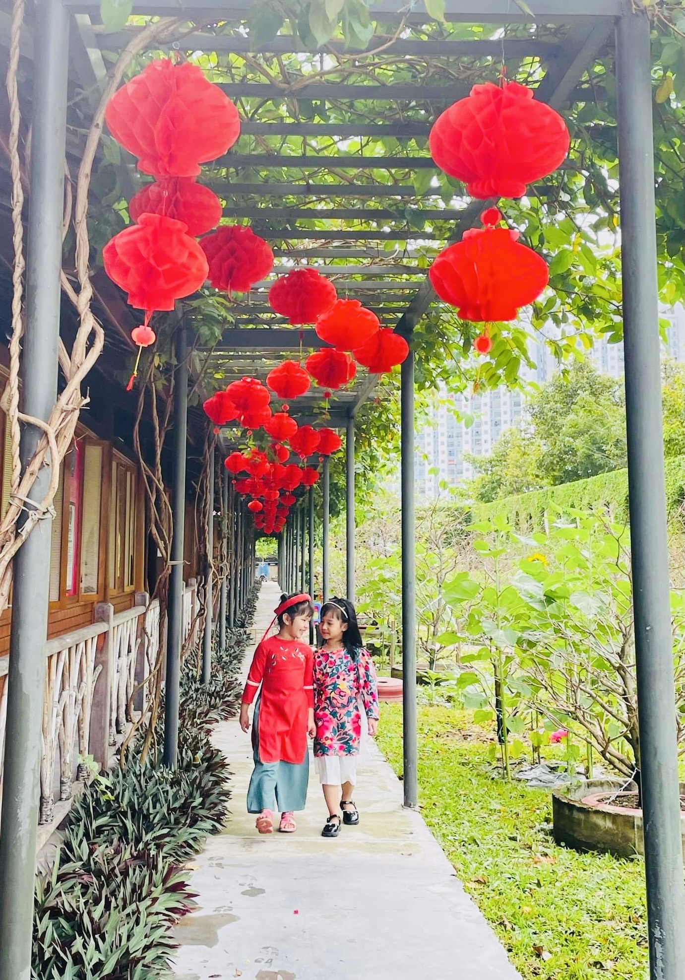 Hai em nhỏ dạo chơi trong không khí mùa xuân của Làng nghề Trường Sơn