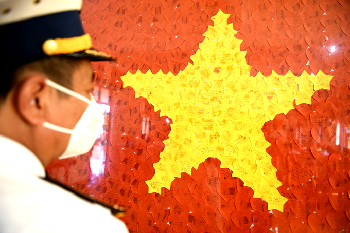 Cờ Tổ quốc được xếp bằng giấy trên đảo Sinh Tồn. |
