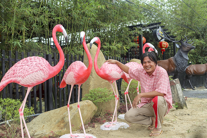 Một buổi chiều tháng 3, chúng tôi có mặt tại khuôn viên nhà vườn của anh Dương tại vùng quê êm đềm ở xã Diên Xuân. Bên cánh đồng lúa vàng rực sắp vào vụ gặt, những pho tượng con voi, cò, nai, hươu cao cổ… của anh như tô điểm thêm cho bức tranh đồng quê nơi đây thêm thi vị. Anh Dương chia sẻ, anh sinh ra ở huyện Hải Lăng (tỉnh Quảng Trị), trong một gia đình có truyền thống làm nghề tạc tượng, nên từ nhỏ đã được truyền dạy những bước cơ bản về nghề. Do hoàn cảnh khó khăn nên anh Dương chỉ học hết cấp 2 rồi theo các anh em đi phụ nghề tạc tượng ở nhiều tỉnh phía nam. Năm 2017, anh Dương lập gia đình và chuyển về sống ở xã Diên Xuân.