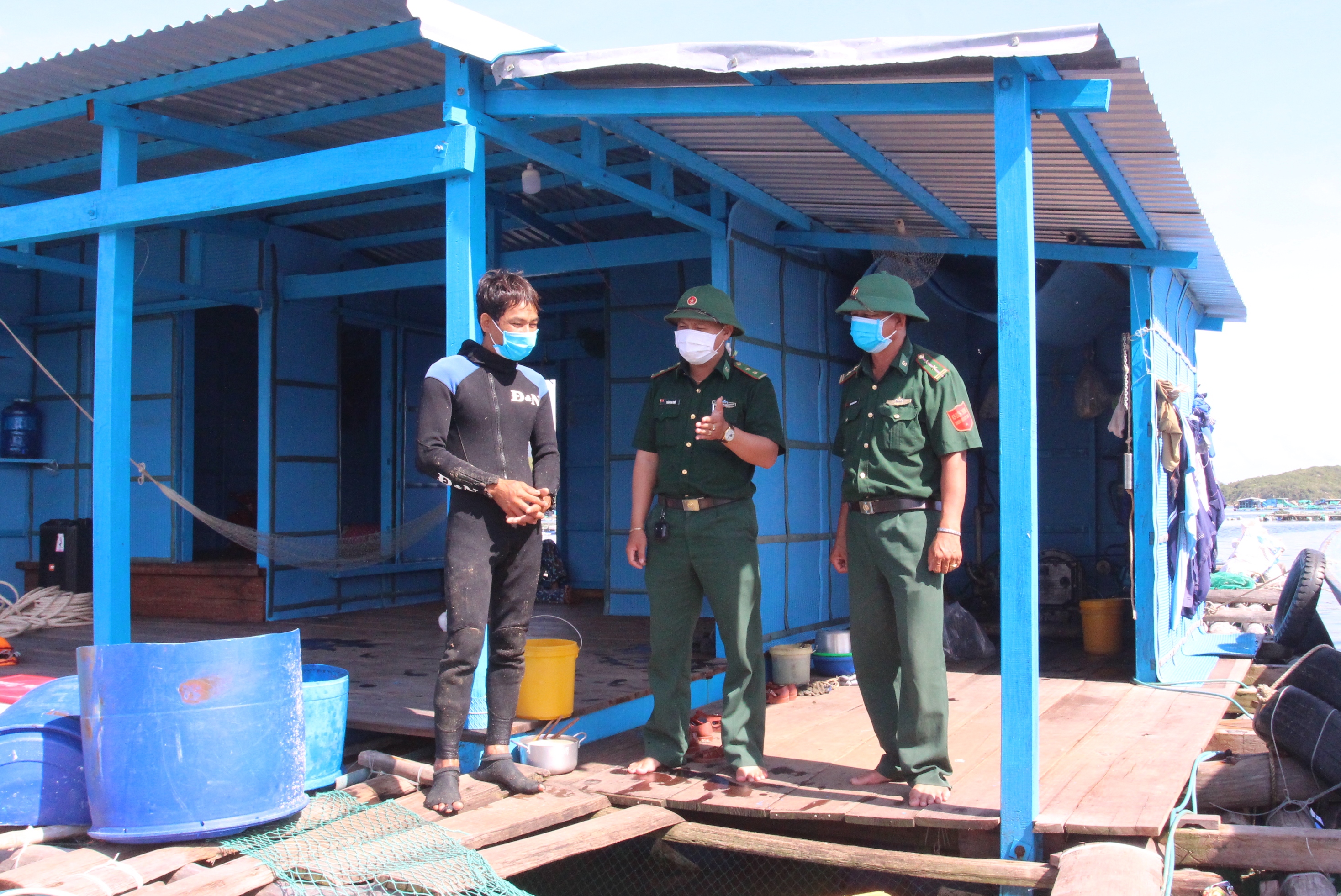 Cán bộ, chiến sĩ Đồn Biên phòng Đầm Môn tuyên truyền vận động chủ lồng bè hưởng ứng mô hình thu gom rác thải. |