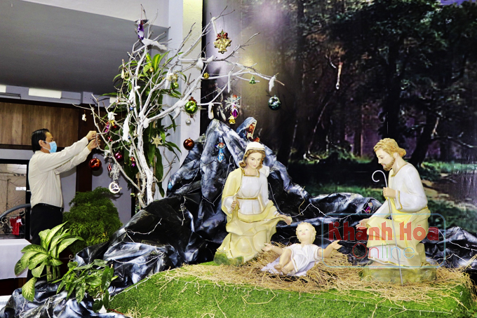Trong khuôn viên Nhà thờ Giáo xứ Núi Sạn (phường Vĩnh Hải, TP. Nha Trang), các giáo dân tất bật trang trí những công đoạn cuối cùng. Người treo cờ Tổ quốc, cờ Công giáo ngoài cổng, người cột lại mảnh xốp trong hang đá vừa bị mưa gió thổi bong ra sau ảnh hưởng của cơn bão số 9. Ông Nguyễn Anh Ngọc - Chủ tịch Hội đồng Giáo xứ Núi Sạn cho biết, mọi năm, giờ này, các hội nhóm của giáo xứ tập trung luyện hát Thánh ca, tập kịch để biểu diễn vào tối Giáng sinh. Thế nhưng năm nay, các chương trình đều được rút ngắn. Ngày Giáng sinh, cha xứ cũng cử hành 4 Thánh lễ, gồm 3 lễ sáng và một lễ chiều (hàng năm chỉ 2 Thánh lễ sáng và chiều) để đảm bảo giãn cách cho giáo dân.