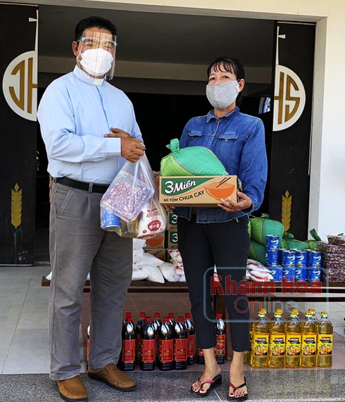 Đại diện Caritas Nha Trang trao quà hỗ trợ cho người dân thị xã Ninh Hòa trong đợt dịch vừa qua. |