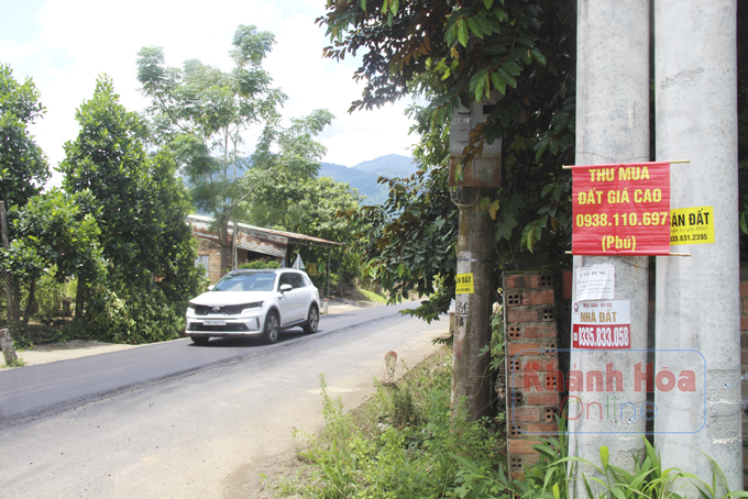 Một tờ giới thiệu thu mua đất kèm theo số điện thoại người cần mua được treo trên tuyến đường từ thị trấn Khánh Vĩnh đi Khánh Bình (huyện Khánh Vĩnh). |