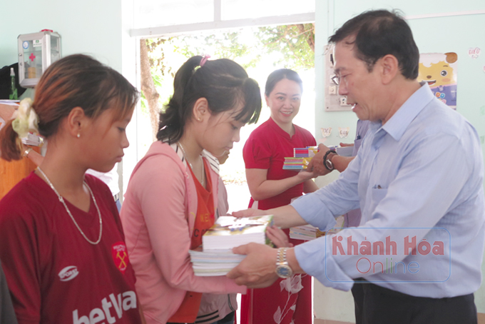 Ông Trần Nguyên Lập -Trưởng phòng Giáo dục và Đào tạo TP. Nha Trang trao tặng sách vở cho học sinh. |
