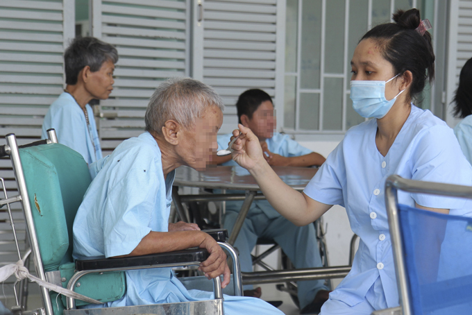 Người bị liệt được các nhân viên đút ăn từng bữa. |