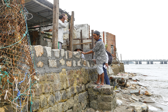 Với những người dân xóm Cồn, chuyện chạy sóng thì năm nào cũng vậy. Cứ mỗi độ cuối năm, sóng gió bời bời, nhà cửa, đồ đạc hư hại không biết bao nhiêu mà tính. Nhưng năm nay, mức độ tàn phá đã khác hẳn và hiện chưa có dấu hiệu dừng lại. Tất bật khuân đá chẻ phụ cho thợ xây, bà Nguyễn Thị Bạn phân trần: “Dãy hàng rào lưới B40 bao năm qua không sao, năm nay sóng lớn đánh bay cả hàng rào, nước biển xộc thẳng vào nhà, tôi phải nâng cao bức tường chắn sóng thêm 1m nữa. Dù biết xây tường cao che được nước nhưng lại dễ bị sóng đánh sập, gây nguy hiểm, nhưng tôi cũng không biết phải làm sao…”. Đang lo xúc cát bỏ vào bao tải để chèn bên ngoài móng nhà, bà Đỗ Thị Cảnh cũng nói chen vào: “Mấy bữa nay, từ 21 giờ tối đến 2-3 giờ sáng hôm sau, sóng lùa vào nhà liên tục làm bà con chạy sóng cả đêm, mệt không thể nào chịu nổi”.