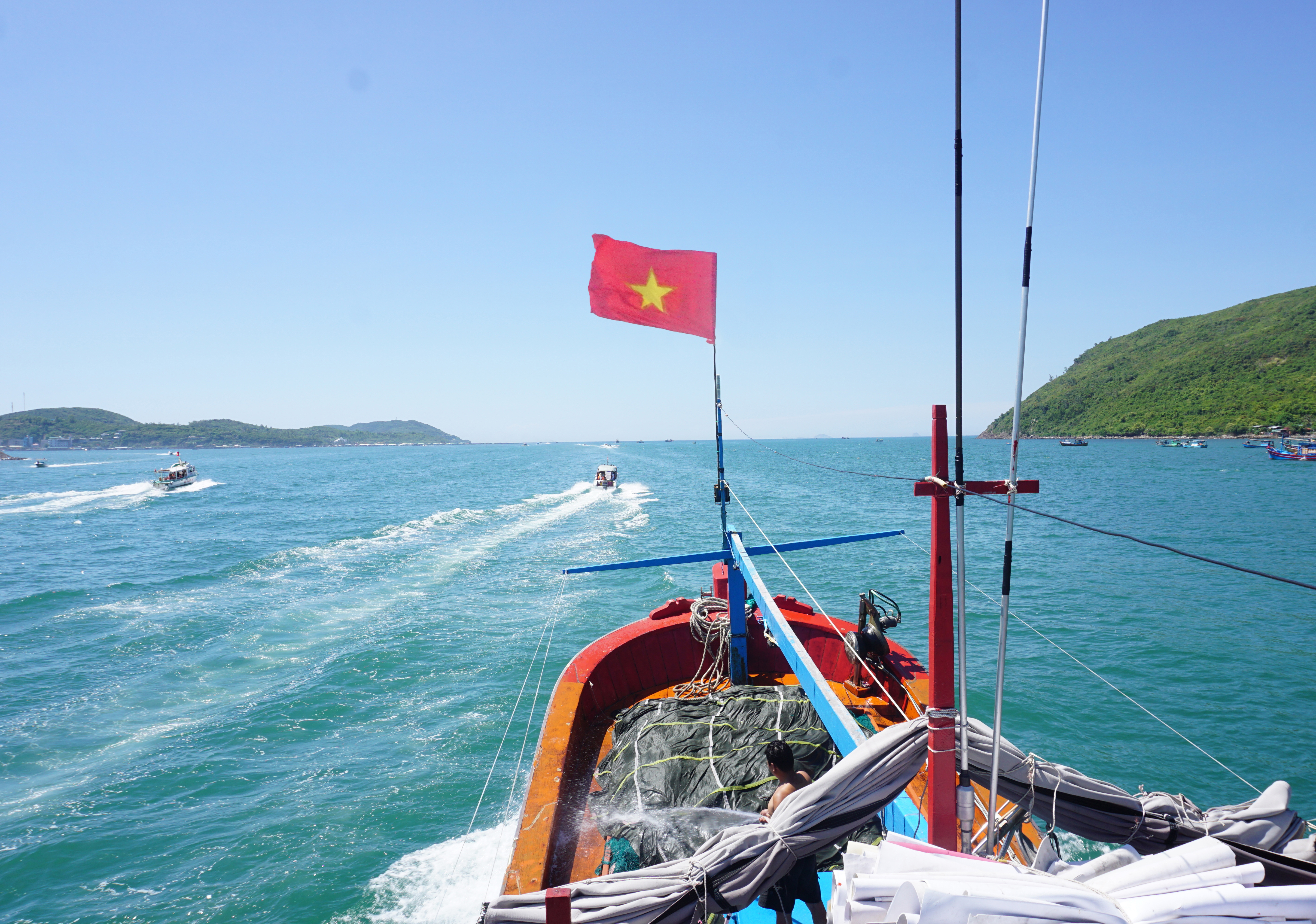 Gần đây, khi Báo Khánh Hòa phối hợp với doanh nghiệp tặng hàng nghìn lá cờ Tổ quốc cho ngư dân bám biển, tôi đã muốn theo những lá cờ đỏ sao vàng vượt sóng ra khơi. Ngày tàu chuẩn bị ra khơi, tôi háo hức đến cảng Hòn Rớ (Nha Trang) từ rất sớm. Lập tức, tôi bị cuốn vào việc tất bật lo “tổn” (nhiên liệu, đá lạnh, nhu yếu phẩm…) của ông Thắng để kịp cho chuyến biển.