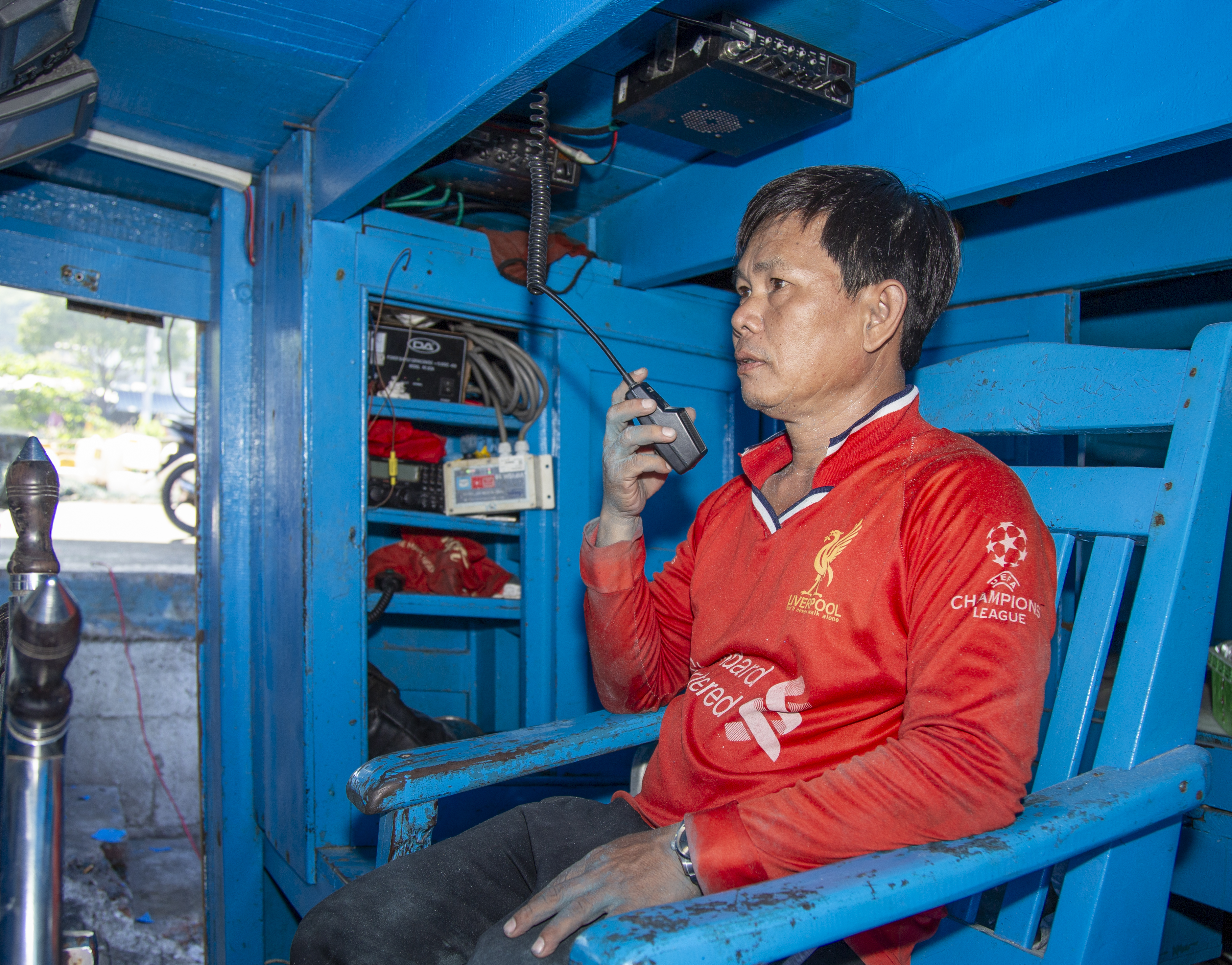 | Thuyền trưởng Trần Quang Thái kiểm tra thiết bị liên lạc trước khi ra khơi. |