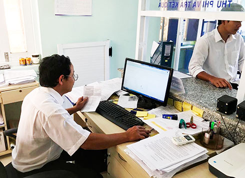 Cán bộ Một cửa UBND huyện Khánh Vĩnh tác nghiệp trên phần mềm của Trung tâm Dịch vụ hành chính công trực tuyến tỉnh. |