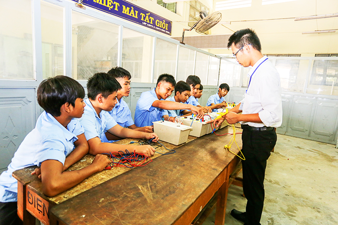 Hướng dẫn học sinh thực hành nghề điện tại Trường Trung cấp Nghề Ninh Hòa. |