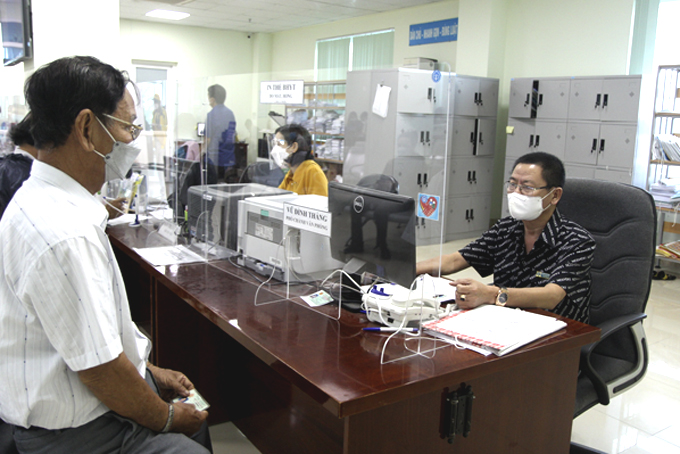 Khi Trung tâm Phục vụ hành chính công tỉnh hoạt động, ngoài lực lượng cơ hữu, còn có người của 23 sở, ngành, trong đó có Bảo hiểm xã hội tỉnh được cử đến làm việc. (Trong ảnh: Giải quyết thủ tục hành chính tại Bảo hiểm xã hội tỉnh) |