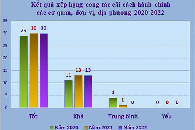| Năm 2022, toàn tỉnh có 43 cơ quan, đơn vị, địa phương là đối tượng đánh giá, xếp hạng kết quả CCHC, giảm 1 đơn vị sự nghiệp trực thuộc UBND tỉnh. Kết quả, 30 đơn vị xếp hạng tốt; 13 đơn vị xếp hạng khá; không có đơn vị xếp hạng trung bình và yếu. So với năm 2021, số đơn vị xếp hạng tốt và khá giữ vững, giảm 1 đơn vị xếp hạng trung bình và duy trì không có đơn vị xếp hạng yếu. |