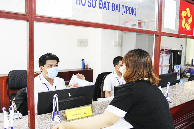 Công chức bộ phận một cửa UBND thành phố hướng dẫn thủ tục lĩnh vực đất đai. |