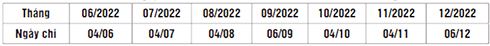 - Chi trả chính: Ngày 04 hàng tháng (kể cả Thứ 7). Nếu ngày 04 hàng tháng trùng với ngày chủ nhật thì sẽ chi trả vào ngày 06 (thứ 3 tuần sau). Cụ thể lịch chi trả từ tháng 06/2022 như sau: