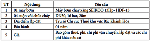 Cục Thuế tỉnh Khánh Hòa có nhu cầu mua máy bơm và các phụ kiện đính kèm với yêu cầu như sau: